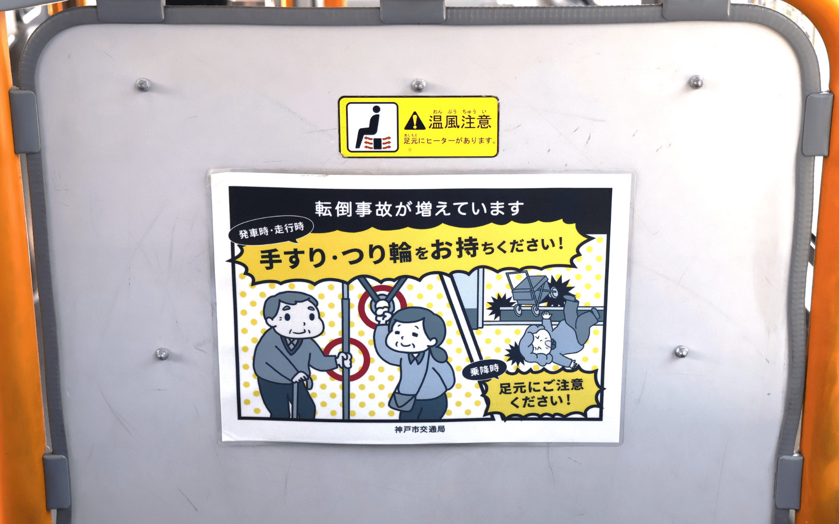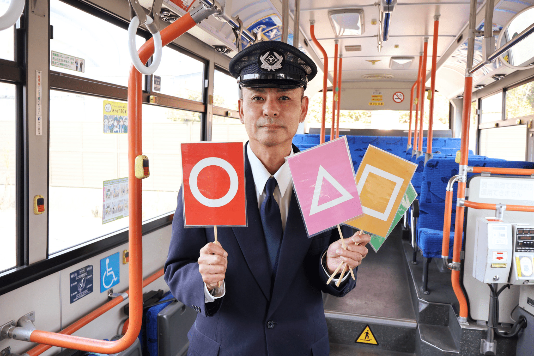 ─車内事故とは、お客さんがバスの中で転んでケガをしてしまう事故のことです。バスが動く時や止まる時に起きやすいので、運転士は丁寧な運転を心がけています。また、「バスが発車します」と呼びかけをしたり、バスが走っている時は席を移動しないようにお願いするなどの安全を守る工夫をしています。